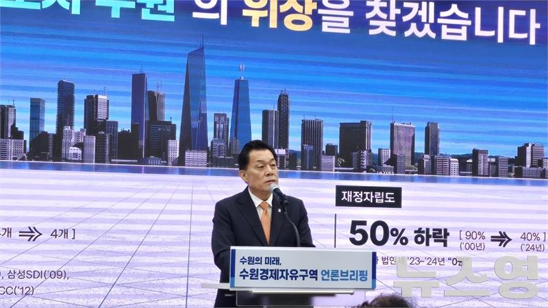 이재준 시장이 기자회견을 열고 수원경제자유구역을 제시하고 있다./사진=뉴스영