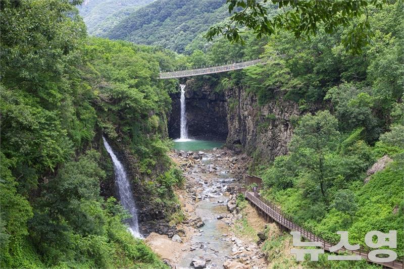 높이 18m의 이중 폭포가 절벽 아래로 떨어지며 거대한 장관을 연출한다. 비 온 다음 날이면 물줄기가 더욱 웅장해진다. 전망대, 출렁다리, 폭포 아래 데크길 등 다양한 각도에서 감상할 수 있다.