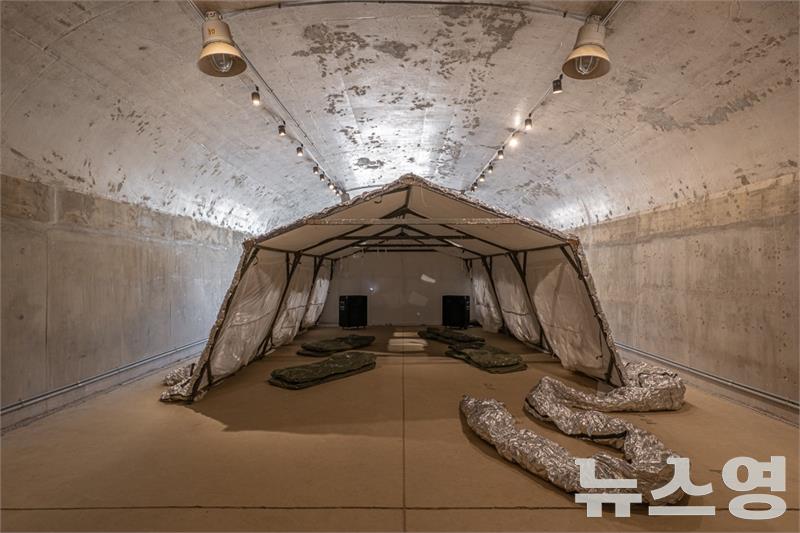 먼저 전시공간 리뉴얼의 하나로, 산업 잔재를 예술로 전환해온 연진영 작가의 신작 ‘주름진 서식지(Folded Habitat)’가 탄약고 2관에서 선보인다. 작품은 실제 미군이 사용했던 막사, 텐트, 생존 담요 등 군용 물품을 해체·재조합해 긴장과 생존의 흔적이 남은 공간을 ‘생명과 공존의 서식지’로 재해석한 설치 예술 작품이다.