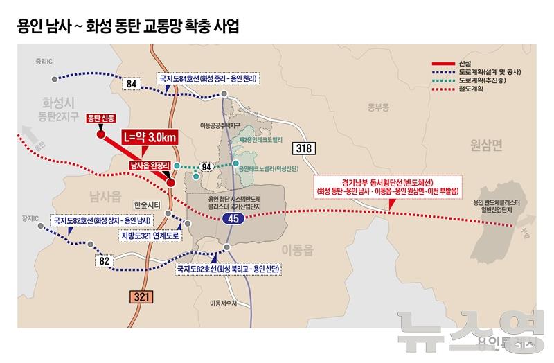 이상일 시장은 "용인 남사·이동읍과 화성 동탄2지구를 잇는 도로를 신설하면 기존 82, 84호선 중간에 새로운 도로가 생겨 차량 분산으로 교통흐름이 한결 원활해질 것"이라고 설명했다.