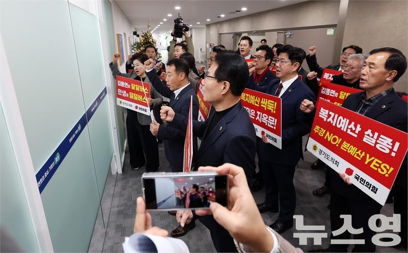 경기도의회 국민의힘 의원들이 김동연 지사 집무실에서 시위를 벌이고 있다./사진=경기도의회 국민의힘