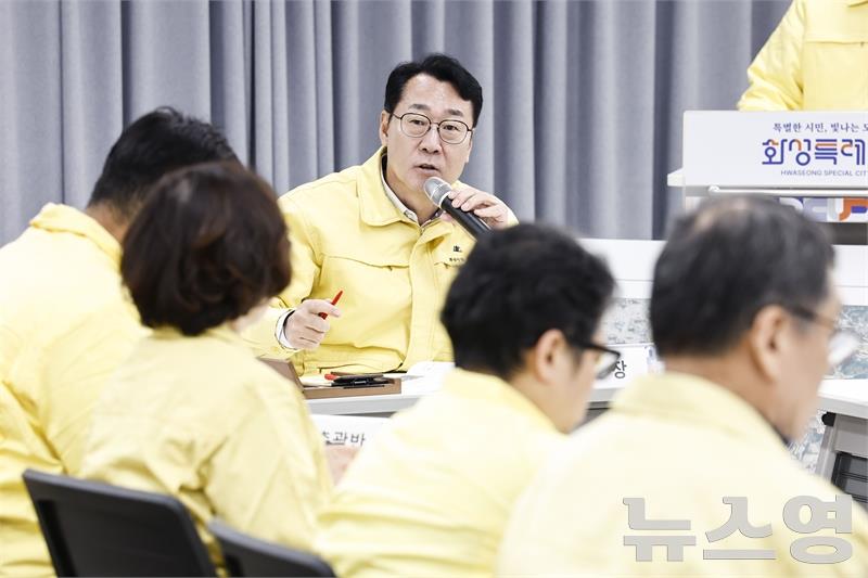 정명근 시장이 동탄숲 생태터널 관련 재난안전대책본부 회의에서 지시사항을 전달하고 있다./사진=화성시