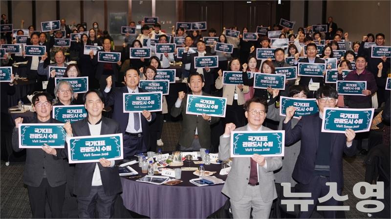 이재준 수원시장(가운데)과 수원화성 3대 축제 성과보고회 참석자들이 함께하고 있다./사진=수원시