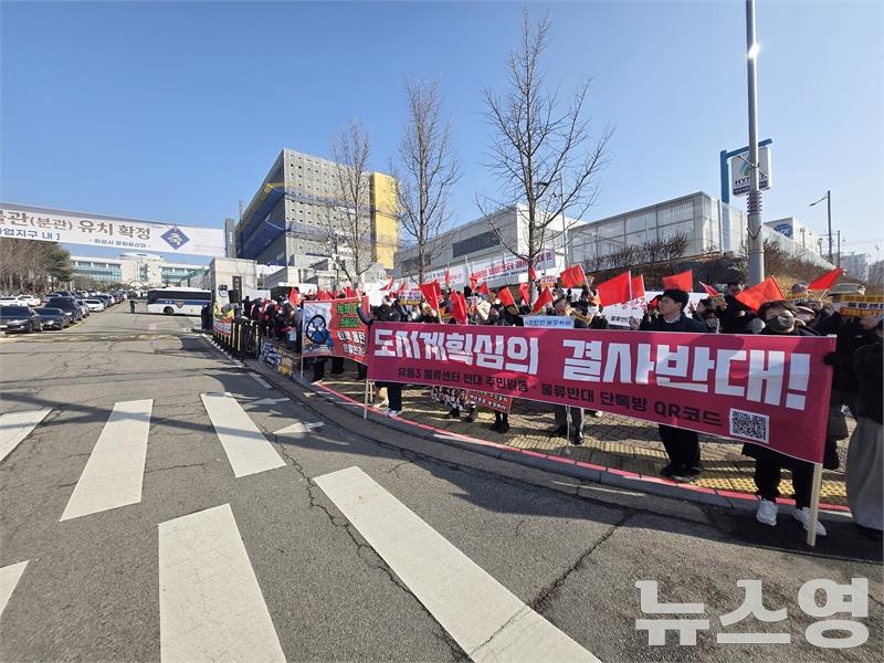 이 시장은 이날 오후 12시 화성시청 앞에서 열린 '동탄2 초대형 물류센터 건립 반대 규탄 집회'에 참석해 사업의 전면 재검토를 촉구했다.