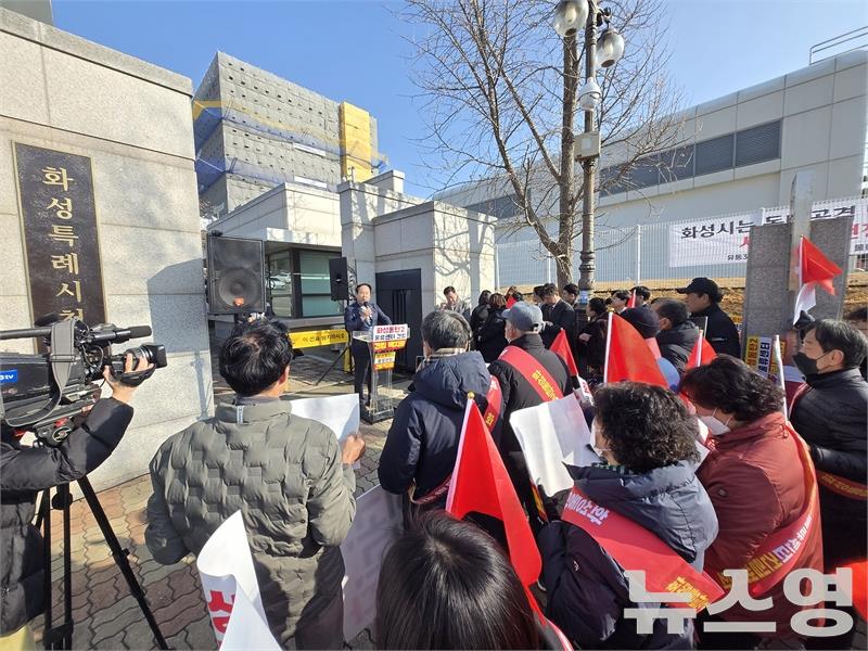 이권재 시장이 화성시청 정문 앞에서 '동탄2 초대형 물류센터 건립 반대 규탄 집회'에 참석해 사업의 전면 재검토를 촉구했다./사진=이권재 시장 페이스북