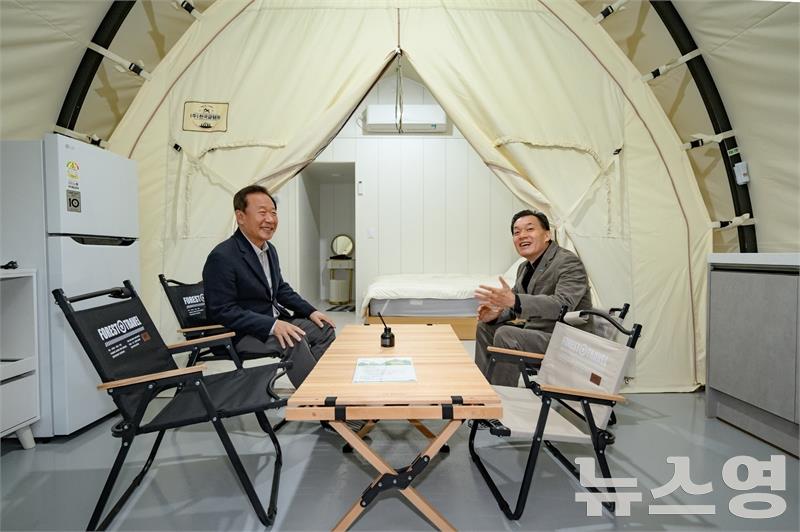 10월 22일 열린 청량산 수원캠핑장 개장식 후 이재준 수원시장(오른쪽)과 박현국 봉화군수가 글램핑 시설을 살펴보고 있다./사진=수원시