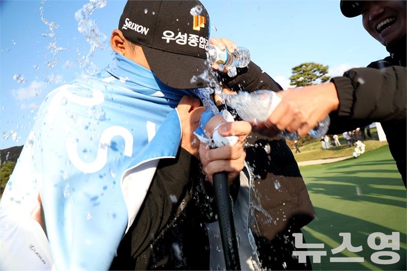 김재호가 우승을 확정짓자 동료들에게 물세례를 받고 있다./사진=KPGA